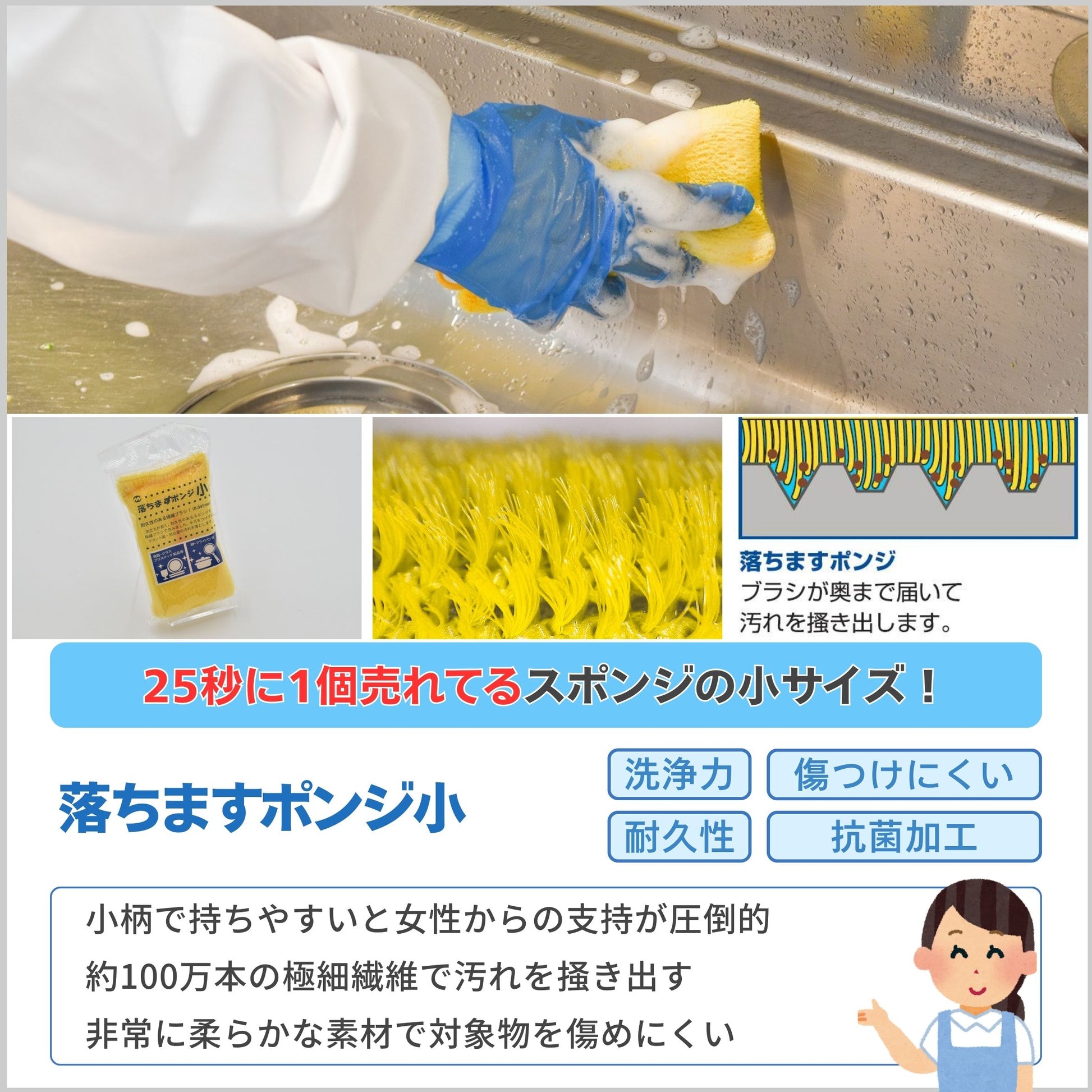 立毛繊維があるので一般的なスポンジでは美しくない非常に細かい部分も洗浄でき、容器なども傷つきにくいです。